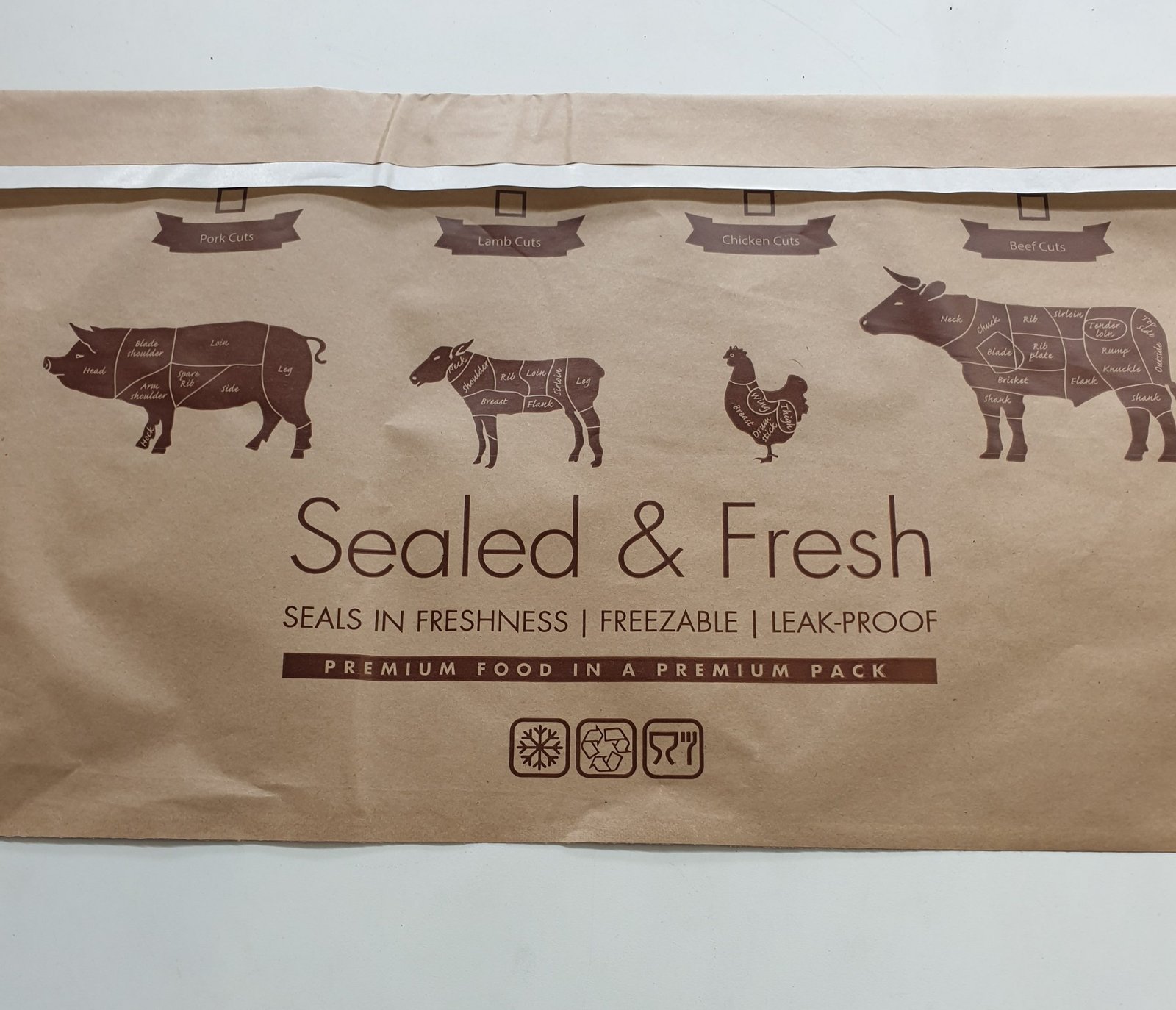 the Kraft paper prevents meat from sweating yet maintaining a leakproof pack. These bags are fridge and freezer safe to make the perfect pack for your meat! Simple to use in store – Just remove the gum strip tape cover, and press seal using the prefolded flaps.